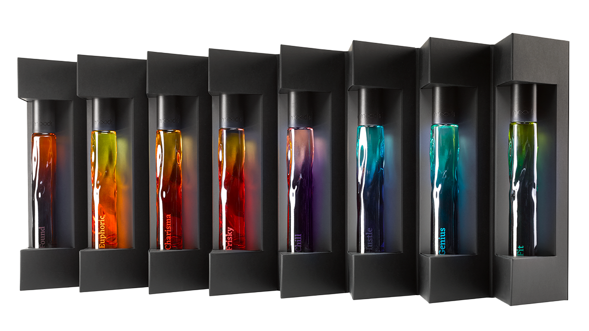 The launch was all about introducing Moods as a modern aromatherapy brand; cool, chic, and with a soft cyber-punk edge. Visually, I drew from early Y2K ads and high-art photography, especially the blurred, kinetic style that captured movement. With eight blends, each with its own colour, the palette became central to the brand language - always paired with black to keep it sleek and elevated.